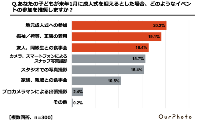 親が子に推奨する成人式のイベント1位は「地元の成人式への参加」(20.2%)。また、「カメラ、スマートフォンによるスナップ写真撮影」(15.7%)が「スタジオ撮影」(15.4%)を抜き4位にランクイン。<結果1>