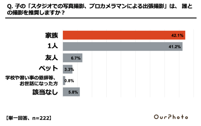 一方で、子に「スタジオでの写真撮影」、「プロカメラマンによる出張撮影」を推奨したいと回答した親に対して、誰と撮影してほしいか聞くと、「家族」(42.1%)が1位となり、次いで「1人」(41.2%)となった。また、自身の撮影ではランクインしていなかった「ペット」(3.3%)が4位に入った。