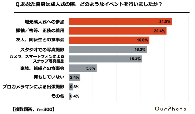 親世代が成人式の際に行ったイベントでは、「地元の成人式への参加」(21.5%)が最も多い結果に。次いで、「振袖/袴等、正装の着用」(20.4%)、「友人、同級生との食事会」(16.8%)がランクイン。