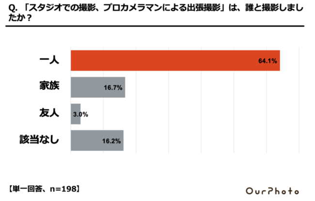 「スタジオでの写真撮影」、「プロカメラマンによる出張撮影」を経験した親が、誰と撮影したか聞くと、「1人」(64.1%)が最も多い結果に。