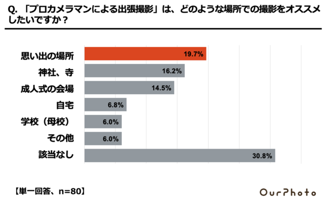 子に「プロカメラマンによる出張撮影」を推奨したい親が、子にオススメする撮影スポットは、「思い出の場所」(19.7%)がトップに。次いで「神社、寺」(16.2%)、「成人式の会場」(14.5%)がランクインした。