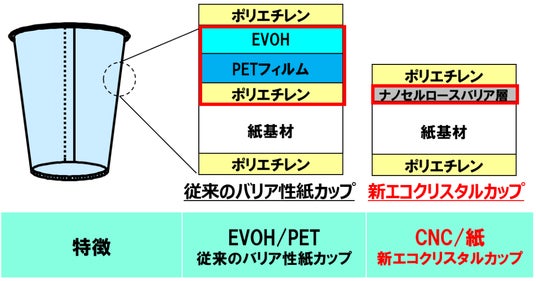 本製品は、高機能で環境に優しい新素材であるCNCを日本で初めて使用した酸素バリア性紙カップです。当社と当社の連結子会社である東罐興業株式会社(本社:東京都品川区、代表取締役社長:田辺宏信)の技術の融合により、CNCを使った紙へのバリアコーティング技術を開発し、紙素材へのガスバリア性付与を可能にしました。