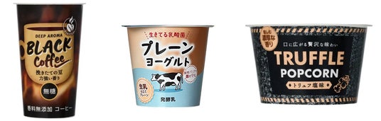 本展示では、本製品の用途展開をイメージしたサンプル3種類(コーヒー・ヨーグルト・ポップコーンのカップ)をご覧いただけます。