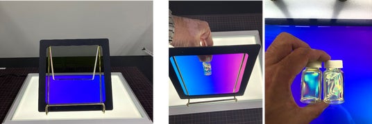新エコクリスタルカップに使用されているCNCの酸素バリア性メカニズムを体感いただくために、CNCの液晶性を可視化できる観察装置を展示します。バリアコーティングに使用されているCNCの分散液※4を振りながら本装置の偏光板を通して見ると、まるでオーロラのように色や光の変化が見られます。この現象は、CNCが液体のように動きながらも互いに作用し自然に整列することで、光の透過や屈折に影響を与え、複屈折が起きるために生じます。その結果、色や模様の変化として観察されます。また、同様にバリア性を有するCNF分散液やバリア性能を改良したCNC分散液についても比較展示を行い、粘度や偏光の違いを体感していただく予定です。