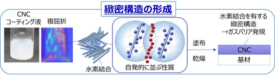 コーティングされたCNCは、自発的に並んでいきながら、酸素を通しにくい緻密構造を形成し、バリアとして機能します。また、従来のバリア性紙カップでバリアフィルムとして使用されていたプラスチックを削減でき、温室効果ガス(GHG)排出量を削減することが可能なことに加え、内容物の鮮度や香りを保護する効果もあります。