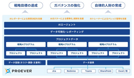 新しいPROEVERは、現場の運用を無理に変えることなく、組織の上位レイヤーに、バラバラに管理されているプロジェクト情報を一つの画面でまとめて見渡せる環境と、判断を前に進めるAI支援を提供します。