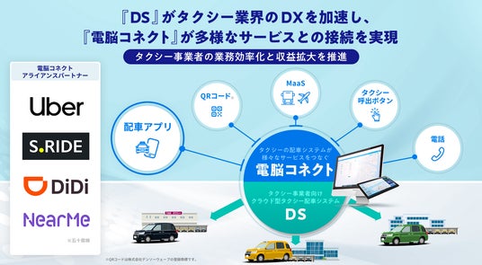 「電脳コネクト」は、電脳交通のクラウド型配車システム「DS」と、配車アプリや交通関連サービスを連携させるシステムです。タクシー事業者の業務効率化と収益機会の最大化を目的とし、配車チャネルの拡充と運用負荷の軽減を同時に実現します。 2025年2月より「電脳コネクト」アライアンスパートナーとしてUberが参画し、国内47都道府県・約600社・約2万1000台のタクシー車両に導入されているム「DS」と、世界70カ国以上で展開されている「Uberアプリ」とのシステム連携が可能となりました。