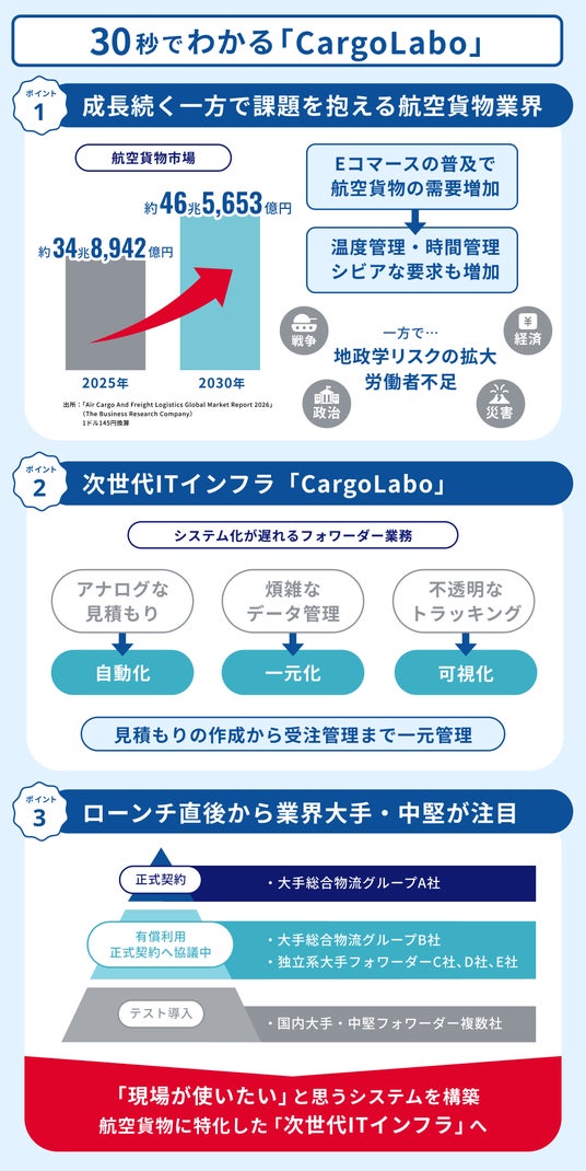 株式会社CargoLabo(カーゴラボ)は、航空貨物に特化した次世代ITインフラ「CargoLabo」を提供するスタートアップです。