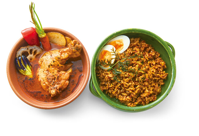 北海道、札幌が発祥のソウルフード「スープカレー」出汁をきかせたスープカレーとスパイスの香りが広がるドライカレーのセットです。