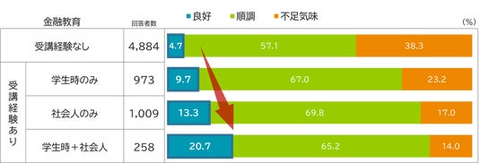 さらに、金融教育の受講時期による金融リテラシー度の違いを分析した結果、「良好」層の割合は「学生時代のみ(9.7%)」よりも「社会人時代のみ(13.3%)」、そして「学生・社会人両方で受講(20.7%)」した人の方が金融リテラシー度は高い傾向にあり、継続的な教育の重要性が浮き彫りとなりました(図表8)。