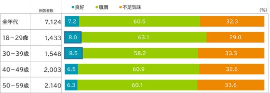 勤労者全体の金融リテラシー度は、「良好」7.2%、「順調」60.5%、「不足気味」32.3%という結果となりました。特に20代・30代では「良好」の割合がそれぞれ8.0%、8.5%と、全体平均よりもやや高い傾向が見られ、若年層において金融リテラシー度の向上が進んでいる兆しがうかがえます。今後の章では、この金融リテラシー度によってどのような行動や意識の違いがあるのかを詳しく見ていきます。