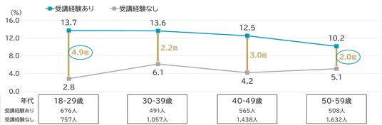 また、金融教育の受講経験の有無によって金融リテラシー度「良好」層の割合を比較すると、すべての年代で「受講経験あり」の方が2倍以上高い結果となりました(図表7)。特に20代では4.9倍と最も大きな差があり、教育の効果が若年層において顕著であることがわかります。一方、50代では2.0倍と差が小さく、年長層では経験や自己学習によってリテラシーが育まれている可能性も示唆されます。