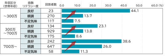 加えて、資産形成への取り組みの熱量を測るため、収入に対してどれだけ資産形成に回しているかを示す「資産形成率」を算出しました(図表3)。この指標を見ると、同じ年収帯であっても金融リテラシー度が高い層ほど資産形成率が高く、収入の活用方法に違いがあることがわかります。