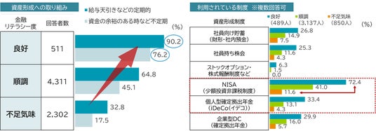 勤労者で金融リテラシー度が高い層は、資産形成に対して積極的な姿勢を示しており、定期的な積立を行っている割合が高い傾向にあります。(図表2)の左図を見ると、金融リテラシー度「良好」層では、給与天引きなどで定期的に積立を行っている人の割合が9割を超えています。