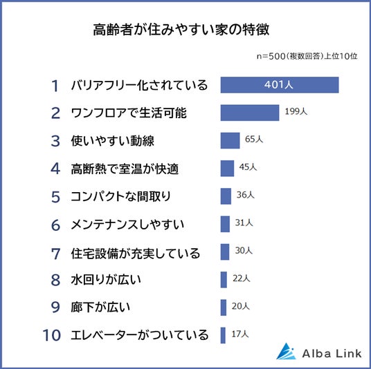 株式会社AlbaLink(本社:東京都江東区、代表取締役:河田 憲二)は、持ち家にお住まいの500人を対象に「高齢者が住みやすい家に関する意識調査」を実施し、そのデータをランキングにしました。