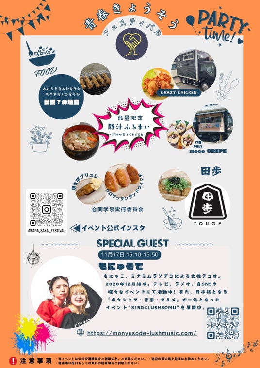 - 15:10 スペシャルゲスト「もにゅそで」ライブ:音楽ユニット「もにゅそで」が出演。迫力のパフォーマンスにご注目ください!