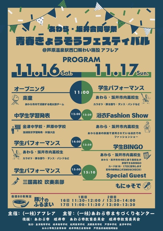 あわら・坂井の高校生が企画し、高校生同士や地域の絆を深める一大イベント「青春きょうそうフェスティバル」が、11月16日(土)・17日(日)に芦原温泉駅西口賑わい施設「アフレア」で開催されます。「きょうそう」には「狂騒・協奏・協創・響奏」の意味が込められており、地元の高校生が集い、地域と共に作り上げる青春の熱気あふれるイベントです。