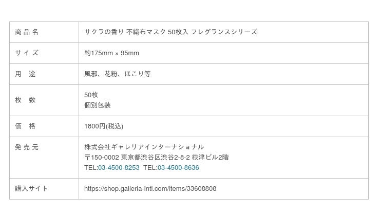 株式会社ギャレリアインターナショナル(本社:東京都渋谷区、代表取締役:阪崎英一郎)は、アロママスクシリーズより、サクラの香り 不織布マスク 50枚入 フレグランスシリーズ(GI-AMK-008)を2020年9月12日 13:00 より発売致します。