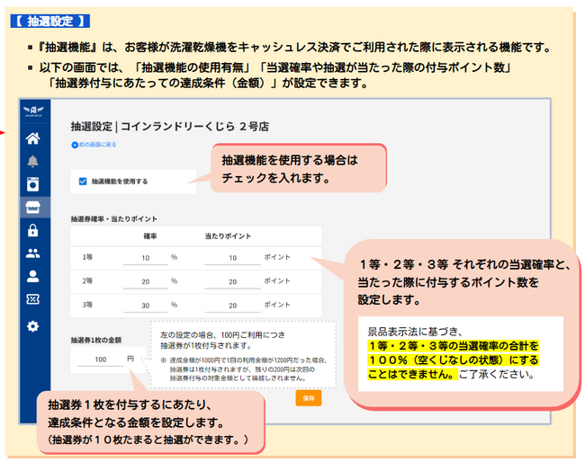 「AdvaNceD IoTキャッシュレス for コインランドリー」に新たに追加された「抽選機能」は、会員登録済みのお客様がキャッシュレス決済を行った後、コインランドリーで利用可能なポイントが当たる抽選に参加できるサービスです。店舗はクラウド管理画面を通じて、抽選機能の利用有無、当選確率、および当選時に付与するポイント数などを設定することができます。
