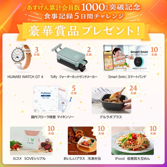 第5弾となる今回は、2024年4月12日より、毎日の食生活や健康管理に役立つ賞品が当たる「食事記録5日間チャレンジ」を『あすけん』アプリ内で実施いたします。