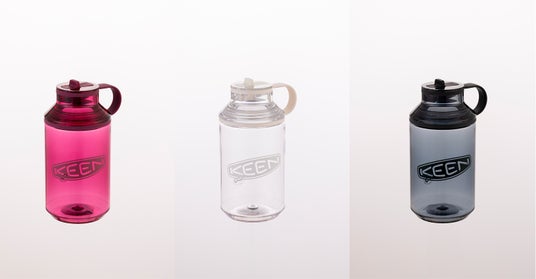 ガラスのような透明度を持ちながらも丈夫で割れにくい、環境に配慮したリサイクル素材の『KEEN ACTIVE BOTTLE』は、600ml・950mlの2サイズ、各3色で展開いたします。