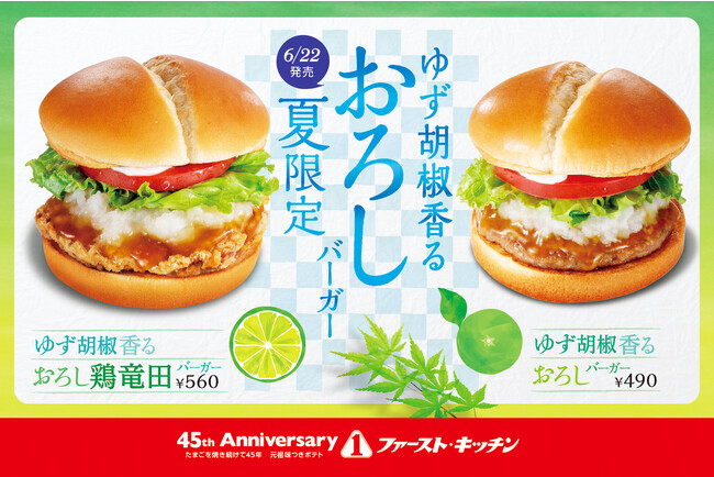 ウェンディーズ・ジャパン株式会社及び、ファーストキッチン株式会社 (所在地:東京都新宿区、代表取締役:紫関修) は、6月22日(木)から、ファーストキッチン全店(競馬場店を除く)で、この夏にぴったりな「ゆず胡椒香るおろしバーガー」と「ゆず胡椒香る鶏竜田バーガー」を夏限定で販売します。徳島県産のすだちがさわやかに香るおろしソースと、ゆず胡椒を使用した旨味ソースを組み合わせてピリッと引き締めました。おろしソースを使用した商品は、2020年7月の発売以来、期間限定として大変好評いただいております。ファーストキッチンの夏の風物詩になりつつある「おろしシリーズ」に、今年はゆず胡椒をアクセントとして加え、さわやかさをアップさせて食欲のそそるバーガーに仕立てました。この夏にぴったりなゆず胡椒香るおろしバーガーをぜひご賞味ください。