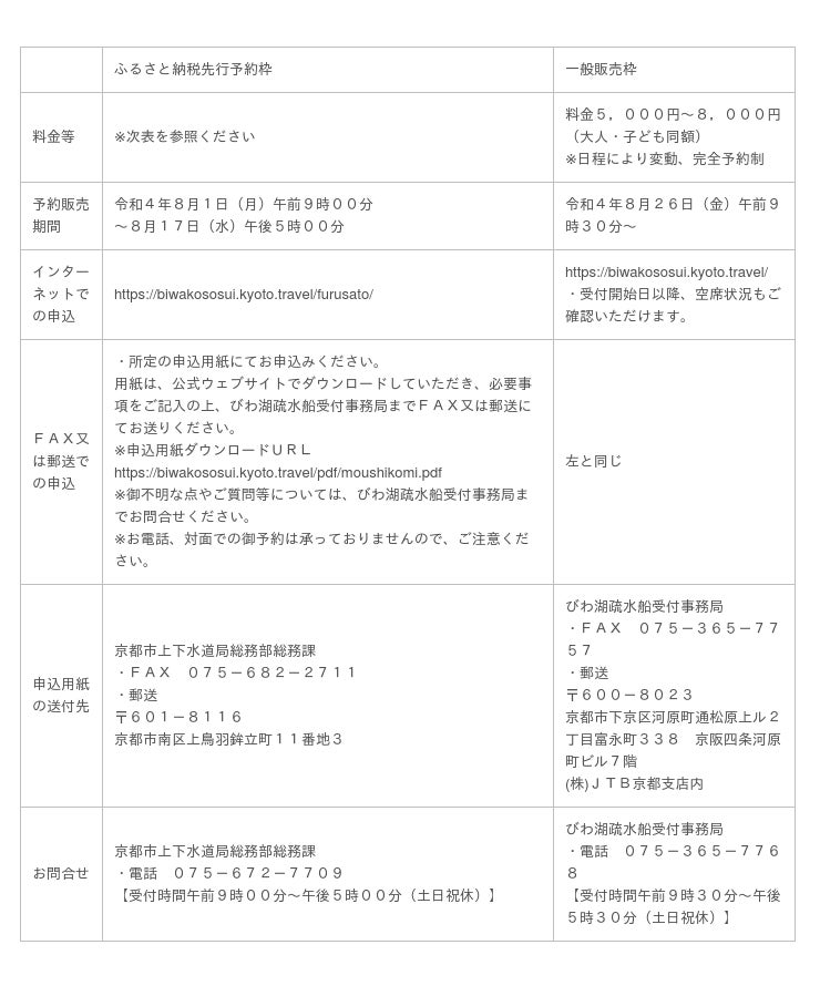 上記の先行予約期間中に、ふるさと納税「日本遺産・琵琶湖疏水応援寄附金」に寄付いただくと一般の方よりもひと足早くご予約いただけます。