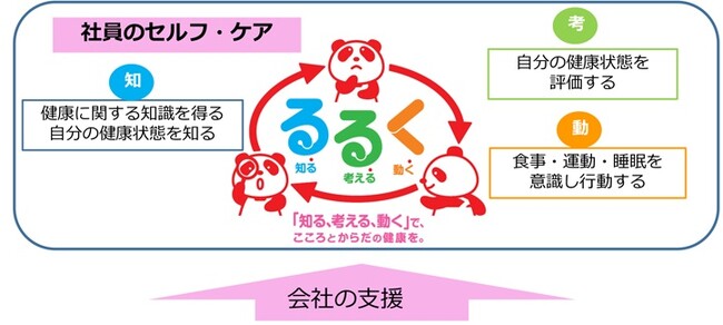 当社グループでは、従業員とその家族の健康が最も重要な経営基盤の一つと考え、職場の栄養改善やセルフ・ケアの維持向上のための施策を展開しており、「味の素グループで働いていると、自然に健康になる」ことを目指し、従業員が「知る、考える、動く」のるるく(R)サイクルをまわすことでセルフ・ケア能力を高めることを支援しています。