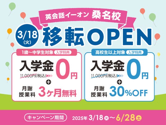 英会話教室を運営する株式会社イーオン(本社:東京都新宿区、代表取締役社長:重野卓、以下「イーオン」)は、2025年3月18日にイーオン桑名校を移転オープンいたします。