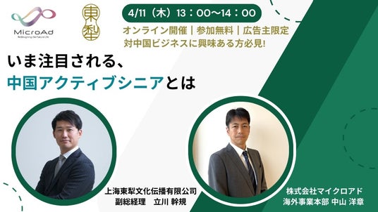 株式会社マイクロアド(本社:東京都渋谷区、代表取締役 執行役員社長:渡辺健太郎、以下 マイクロアド)と上海東犁文化伝播有限公司(本社:上海 総経理:張磊、以下「上海東犁」)は共同で、インバウンドマーケティング担当者向けに、中国で今注目される「アクティブシニア市場」の実態と、中国現地の最新情報を解説するウェビナーを開催いたします。