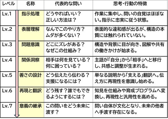 人間の思考は、“問い”を通じて深まっていきます。以下のモデルは、問いの質の違いが思考・行動・意味づけにどのように影響するかを7段階で可視化したものです。