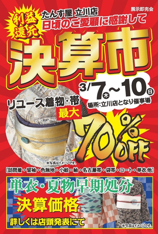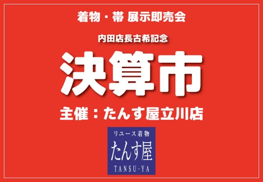 たんす屋立川店は、この度、日頃のご愛顧に心より感謝を込めて、2024年3月7日(木)から3月10日(日)までの4日間、隣接する催事場にて「決算市」を開催いたします。