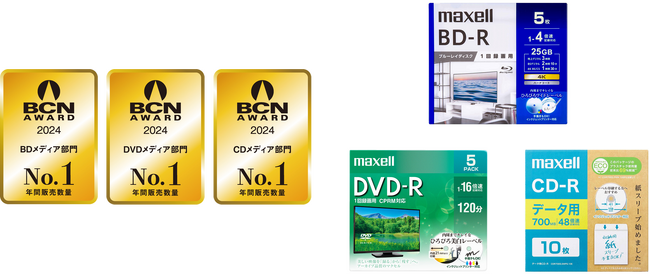 マクセル株式会社(以下、マクセル)の記録メディア各種が、このたび、BCN AWARD 2024(運営:株式会社BCN/以下、本賞)の「BDメディア部門」「DVDメディア部門」「CDメディア部門」において、7年連続で最優秀賞を受賞しました。