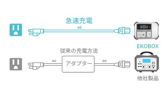 「EKOBOX」では独自開発した急速充電技術を採用しているため、従来のACアダプターを介する遅い充電とは異なり、付属のケーブル1本で急速充電できます。AC充電入力は最大で800W、わずか2時間でフル充電できます。