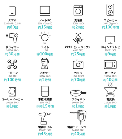 キャンプ時に小型オーブンや扇風機、スマホ、タブレット、カメラなどを使うことが多い方は、同時に複数のデバイスに充電できるのは心強いです。