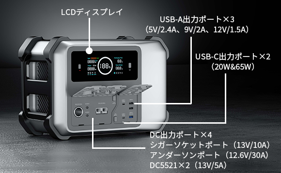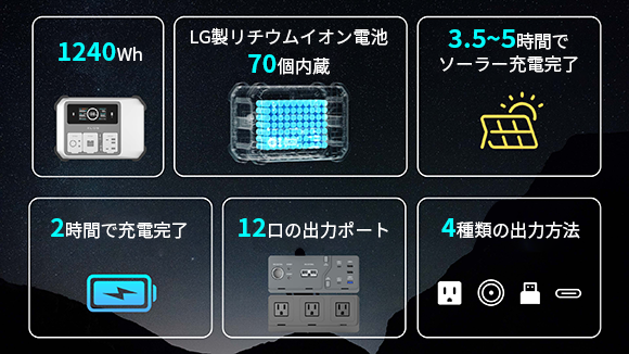 【336,000mAh容量・最大1800W出力・12個の出力ポート・2時間で充電完了】