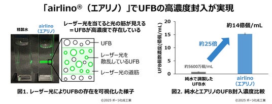 本技術「airlino(R)(エアリノ)」は、セラミック技術から派生して生まれたUFB製法に、自社で培った化粧品の処方技術を掛け合わせることで実現しました。上記の製法では、多孔質セラミックスから水中に空気を押し出し、「ちぎる」ことでUFBを発生させます。ポーラ化成工業では、このプロセスにあらかじめ特定の化粧品原料を混ぜることで、「1mLの液中に約14億個」という、純水の実に20倍以上(※2)の高濃度でUFBを封入することに成功し、さらに必要な濃度を安定して維持する技術も確立しました(図2)。またこの度、UFBの存在と品質管理方法がFBIAの基準に適合したことにより、製品登録制度に登録されました。