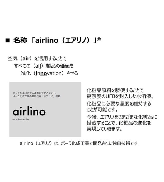 ポーラ・オルビスグループの研究・開発・生産を担うポーラ化成工業株式会社(本社:神奈川県横浜市、社長:片桐崇行)のウルトラファインバブル(※1)の独自技術「airlino(R)(エアリノ)」が、一般社団法人ファインバブル産業会(FBIA、補足資料1)の定めるUFBの存在と品質管理方法の基準に適合したことにより製品登録制度に登録されました。「airlino(エアリノ)」は今後、化粧品に活用されます。