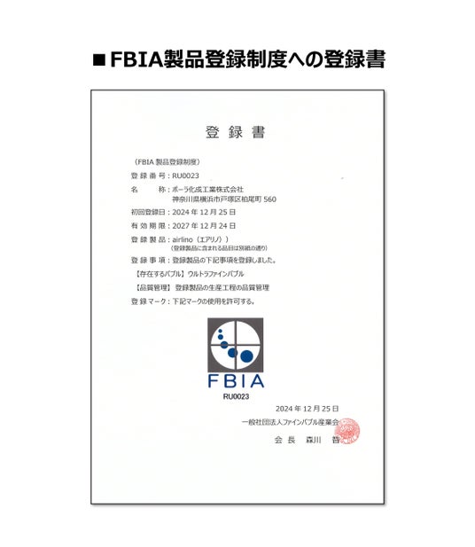 ファインバブル技術の国際標準化を推進するFBIAの製品登録制度に登録
