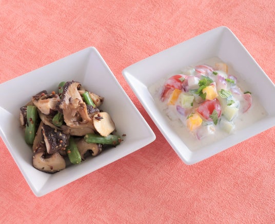 (左)3種のきのこのアチャール / (右)カルダモン香るライタ~ヨーグルトのサラダ~