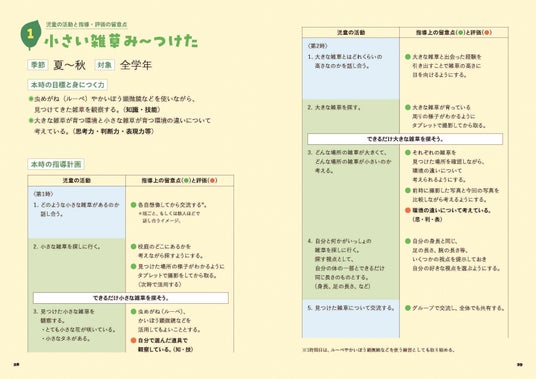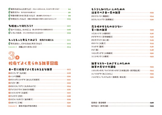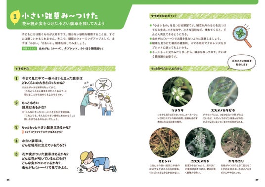 29のプログラムと指導・評価の留意点、図鑑ページでは40の雑草と観察ポイントをイラストたっぷりの構成でわかりやすく解説しています。