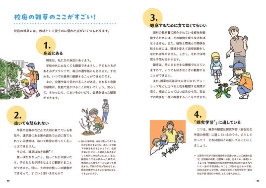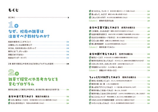 植物に詳しくない学校の先生や保護者も、本書の「探究学習プログラム」と「校庭でよく見られる雑草図鑑」で子どもたちの思考力、判断力、表現力を引き出せます。