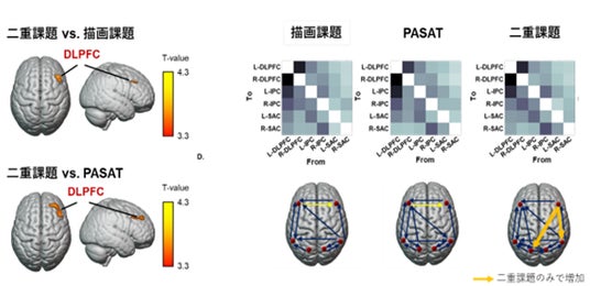 図2. 二重課題に特異的な右前頭葉の脳活動と右前頭頭頂領域におけるネットワークの結合性増加。