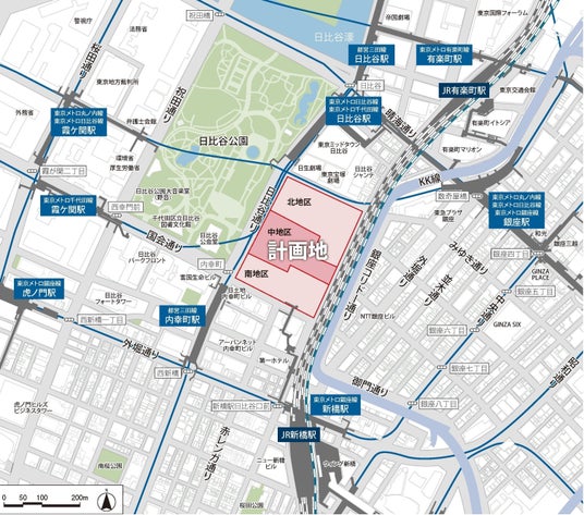 当街区は、地上部や低層部などを介して、将来的には大丸有・銀座・霞が関・新橋といった都心主要拠点や日比谷公園とつながる、駅・まち・公園一体の歩行者ネットワークを形成します。