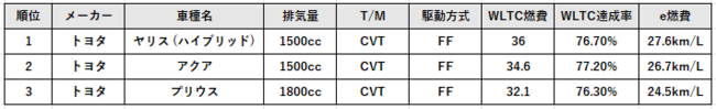 「WLTCカタログ燃費達成率部門」:現行販売されている車種(プラグインハイブリッド車は除外)のみを集計対象とした、WLTCカタログ燃費に対する実燃費の達成率ランキング。