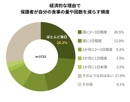 また、経済的な理由で保護者が自分の食事の量や回数を減らす頻度について質問した結果、食事を減らすことがある人のうち、「ほとんど毎日」との回答が最多を占めました。
