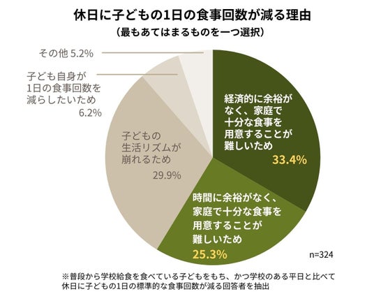 休日に子どもの食事回数が少なくなる理由としては、「経済的に余裕がなく、家庭で十分な食事を用意することが難しいため」が最多を占めています。