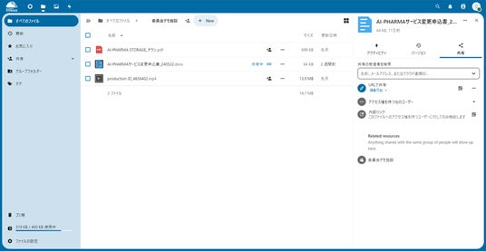 - AI-PHARMA内に追加された「AI-PHARMA STORAGE」のページから、手軽にデジタルファイルの格納や管理ができます。
