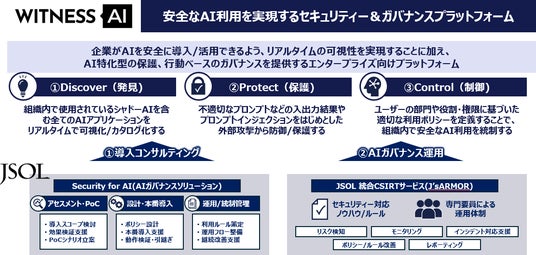 株式会社JSOL(以下、JSOL)は、AIガバナンス分野の先進的なソリューションを提供するWitnessAI, Inc.(本社:米国)とリセラー契約を締結しました。同社製品の「WitnessAI」は、生成AIやAIアプリケーション、AIエージェントの利用に伴うリスク管理および統制を支援するプラットフォームで、生成AIの利用普及や自立型AIエージェントの活動に伴って浮上している「プロンプトインジェクション」などの新たなリスクからユーザー企業を防御します。JSOLではさらに、自社オリジナルの統合CSIRTサービス「J’s ARMOR(TM)」※1と連動することで、セキュリティー運用に関するノウハウを生かした包括的なAI統制を実現します。