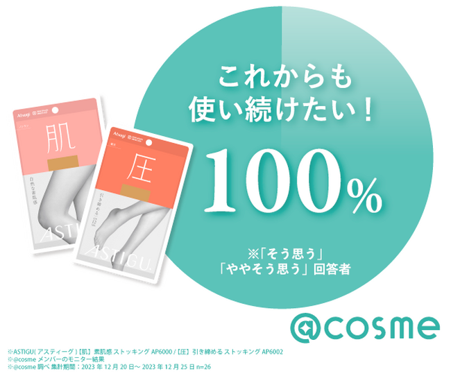 @cosmeメンバーにアスティーグ【肌】、アスティーグ【圧】をお試しいただきました。調査に対する「これからも使い続けたい!」の回答は100%。快適なはき心地で脚を美しく見せるASTIGUにコメントをお寄せいただいています。